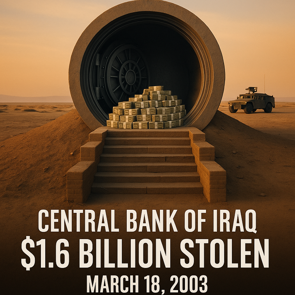 As the United States prepared to invade Iraq in March 2003, one of the most stunning acts of pre-war looting took place. At the direction of Saddam Hussein himself, an estimated $1 billion in U.S. banknotes was withdrawn from the Central Bank of Iraq by his son Qusay Hussein. It was reportedly loaded into trucks during the night and vanished from public record.