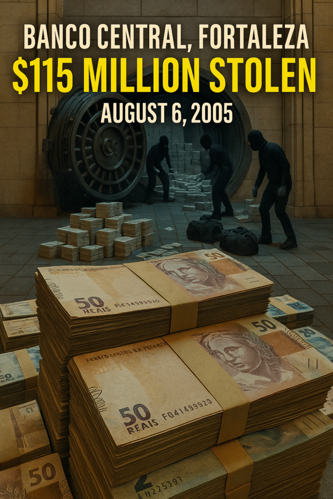 Perhaps the most cinematic heist on the list, a gang in Brazil spent three months digging a tunnel under the Banco Central branch in Fortaleza. The tunnel spanned 78 meters and had lighting, ventilation, and reinforced walls. On a quiet weekend, they broke through the floor of the vault and removed 3.5 tons of Brazilian reals, totaling $115 million.