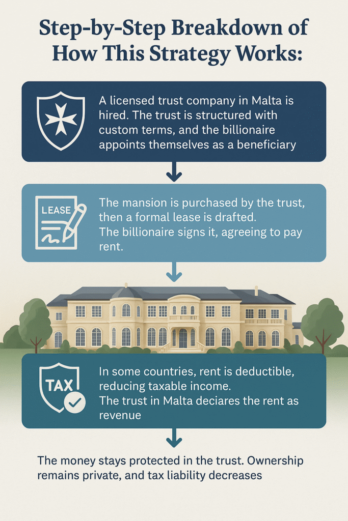 Billionaires do not list mansions under their personal names. They use offshore trusts to create legal distance between themselves and the property. One of the most popular places to register these trusts is Malta. A trust registered in Malta can own real estate, bank accounts, or entire companies. The ownership is kept private. The names of the real controllers and beneficiaries are not publicly disclosed.